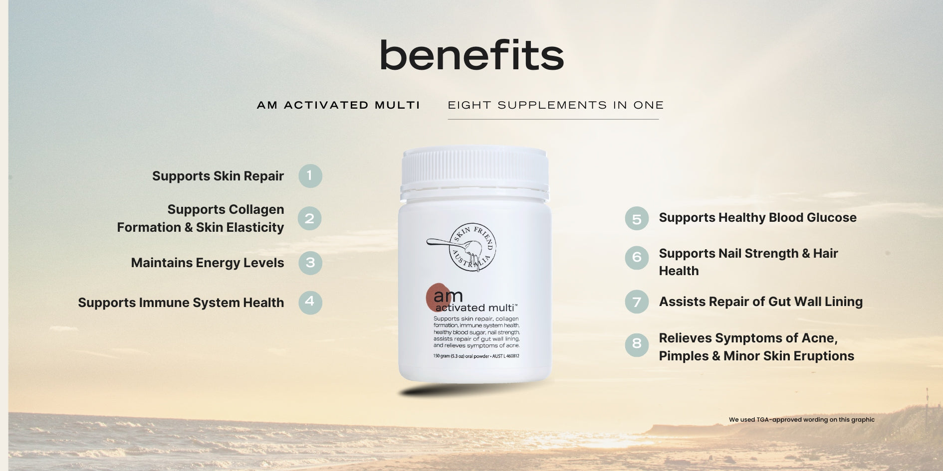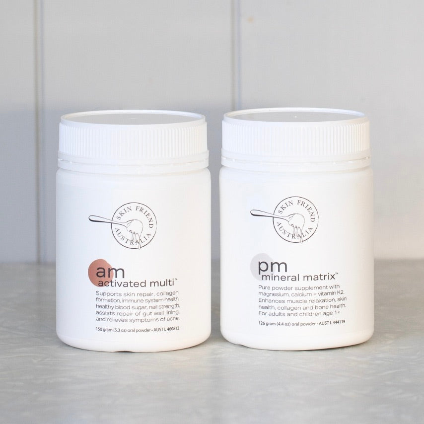 Skin Friend AM Activated Multi is for people who have dull, ageing or irritated skin, or those with low energy who want to feel better. Zen Friend PM is for people who want to relax and sleep better. Together they support skin, gut, energy, sleep and general health and wellbeing in a simple morning and afternoon ritual.